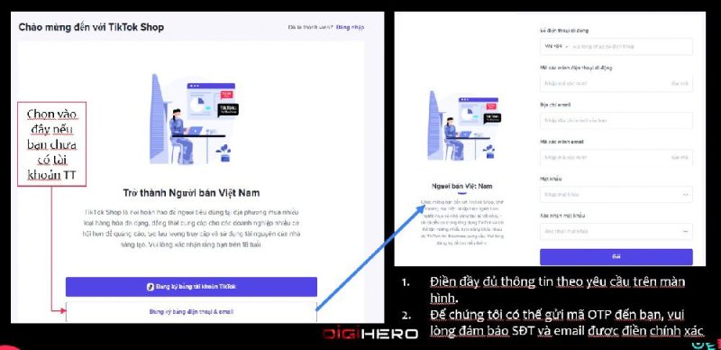 Để bắt đầu bán hàng, cần tạo tài khoản TikTok Shop tại đâyNếu đã có tài khoản TikTok, hãy bấm: “Đăng nhập“.